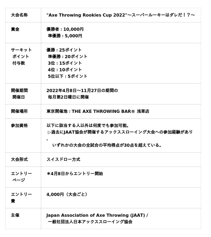 「"Axe Throwing Rookies Cup 2022"~スーパールーキーはダレだ!?~(以下、「当大会」)」とは、東京と大阪で毎月第2日曜日に開催される、初級者限定のAXE THROWING(斧投げ)の大会となります。当大会に参加、もしくは上位入賞することで、「斧投げ日本一決定戦。"Japan Axe Throwing Championship 2022 @TOKYO"」への出場権を獲得するために必要なサーキットポイントを貯めることができます。その他にも、参加者限定の特典として協会オリジナル斧とAXE THROWINGの利用料がセットになったお得なパッケージプランの購入や、上位2名までには賞金が与えらます。