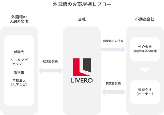 当社が間に入ることで、外国籍の方のお部屋探しに関する不安やオーナー側の懸念を解消できると考えています。リベロは2012年から法人企業の転勤をサポートしており、全国約3,000店舗の提携不動産会社を有しているため、どのエリアでもお部屋探しを依頼可能です。入居者の希望を事前にヒアリングし、スムーズに不動産会社と連携できることも当社の強みです。すでに実績のあるこの仕組みは外国籍の入居者にも活用できるため、お部屋探しの不安を解消します。