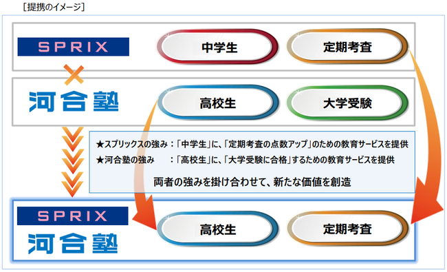 このような背景を踏まえ、スプリックスが持つ定期考査での点数アップのノウハウと、河合塾が持つ大学受験対策・高校生指導での知識・経験とを掛け合わせることで、ニーズ拡大が見込まれる「高校生の定期考査」領域に新しい価値を提供すべく、本業務提携にいたりました。