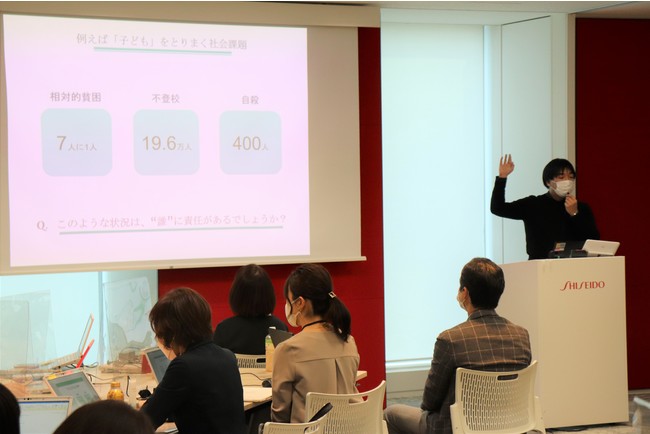 株式会社Ridilover(以下、リディラバ:代表取締役 安部敏樹)は資生堂ジャパン株式会社(以下、資生堂)が地域の社会課題に向き合う社員研修において、「守りの“社会貢献”から、攻めの“社会創造”へ」と題し、企業が社会課題解決に向き合う意義を現場視点から考察・共有しました。今回のプログラムは、社会課題を知る座学にとどまらず、研修を契機に今後の具体的なアクションを生み出すものであり、最前線で活動する現場社員が先導してESG経営を実現する取組みとして、先進的かつ大きなチャレンジといえます。リディラバは、企業の事業戦略をより「社会化」する今回のような取組みを通じて、ビジネスセクターのアップデートを今後も一層推進してまいります。