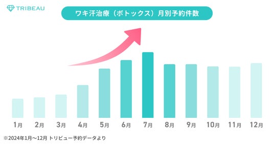 ダウンタイムがしっかり取れる時期を考えて、施術日を決めると良いでしょう。ワキボトックスの施術予約は、毎年4月以降の気温上昇とともに件数が大きく伸び、7月頃にピークとなる傾向があります。本格的な暑さが訪れる前に施術を受けられるように早めの予約がオススメ。