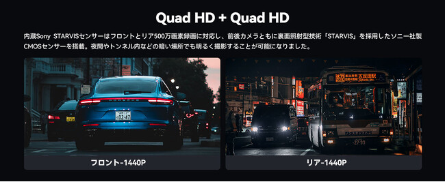 また、ソニーの日本製センサーSTARVIS IMX335 5MPセンサーを内蔵し、前後にQuad HD 1440P 30fpsのカメラを搭載しており、WDR技術を使用して朝晩関係なく明るく見やすい映像になります。偏光フィルター(別売)を使用すると、ダッシュボードの映り込みを大幅に防ぐことができ、高画質の映像でドライブの思い出を鮮明に撮影することができます。