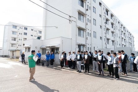当日は、ビレッジハウスを社宅として利用している地域の企業と連携のうえ、当該企業に勤務するベトナム人技能実習生41人とインドネシア人技能実習生1人の合計42人が参加し、富山県防災士会の防災士・江尻泰将氏による防災講義と演習を行いました。ハザードマップを確認しながら地域で発生の可能性がある地震や津波、洪水について学び、室内の危険要素も確認しました。地震発生時に身を守る動作「シェイクアウト訓練」、備えておきたい防災グッズの確認、いざという時のために消火器の取り扱い方を体験し、防災意識を高めるきっかけとなりました。