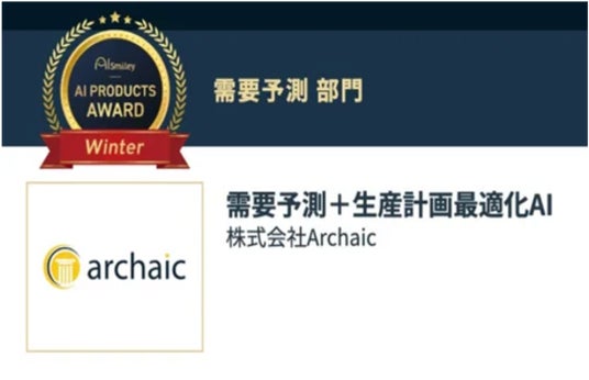株式会社Archaic(本社:東京都渋谷区、代表取締役CEO:横山 淳、下:Archaic)は、「需要予測+生産計画最適化AI」が「AIsmiley AI PRODUCTS AWARD 2025 WINTER」の需要予測部門でグランプリを受賞しことをお知らせします。