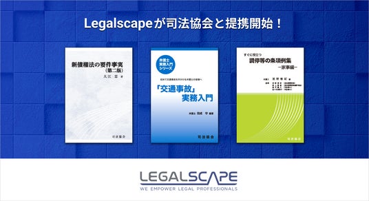 株式会社Legalscape(本社:東京都文京区、代表取締役社長・最高経営責任者:八木田 樹、以下リーガルスケープ)は、一般財団法人司法協会(所在地:東京都中央区、代表理事:大門 匡)と新たに提携し、書籍の掲載を開始したことをお知らせします。