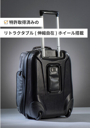 特許取得済みのリトラクタブルホイールは、キャリーバックのハンドルを上げると自動的に出て、ハンドルを下げるとケース内に完全収納されます。