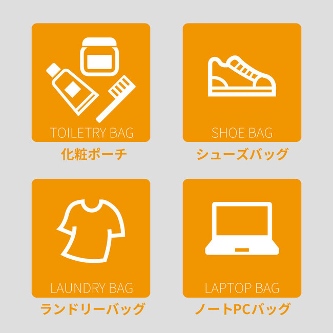 化粧ポーチ、シューズバッグ、ランドリーバッグ、ノートPCバッグなどの旅行アクセサリーも付属。整理整頓が簡単でパッキングも楽々に完了!