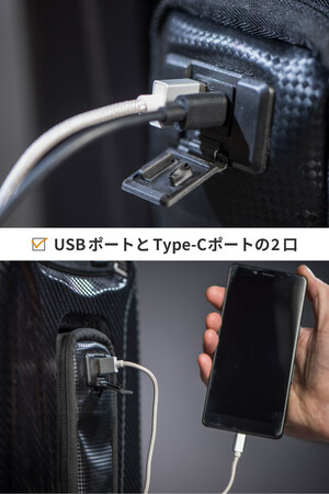 内蔵USBスロットと充電ポケットを完備。移動中に使用しながらもスマートフォンやガジェットをスマートに充電することが可能です。※充電バッテリーは付属致しません。
