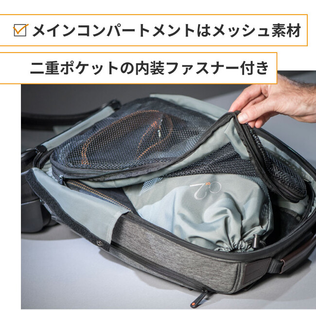 目的別に設計されたポケットや隠しコンパーメント、クイックアクセスポケットなど、収納スペースが充実。荷物を安全に整理して収納できます。旅行中もアイテムへのアクセスがスムーズです。