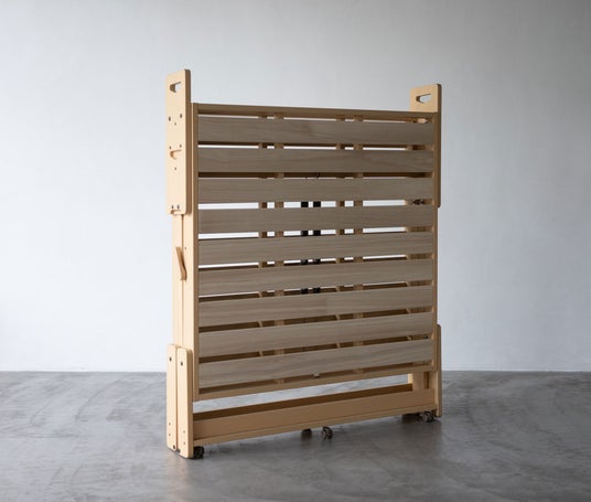 2.TATAMU-BED-折りたたみベッド-エムールの「TATAMU-BED」は一般的な変形しないベッドよりも強固で頑丈な構造設計でつくられています。もちろん軋みやギシギシといった音もありません。ベッドをたたんで動かすことができるメリットとして掃除やスペースの確保がしやすいことがあげられます。