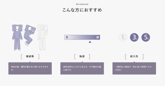それぞれの商品カテゴリーに合わせて商品特徴がわかりやすく表示されています。寝心地や座り心地に関する研究やショールームにお越しになったお客様の声から、『お客様の気になる!』をわかりやすく可視化しました。