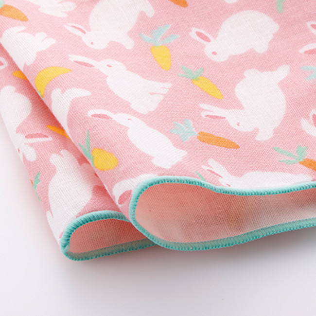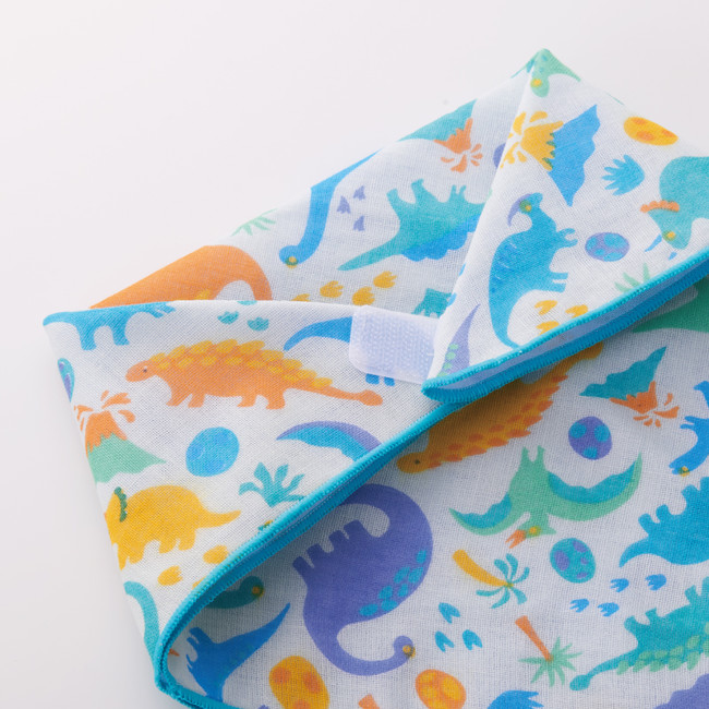 本体には職人が丁寧に織り上げた日本製のガーゼを使用しています。昔ながらの「和晒(わざらし)」仕上げで、ふんわりとした肌触りが特徴です。スタイとして使用する際は、面ファスナーで赤ちゃんの首に簡単に着用することができます。ガーゼの縁や裏面にもやさしくかわいらしい色を染色しているので、ファッションとしてもお楽しみいただけます。