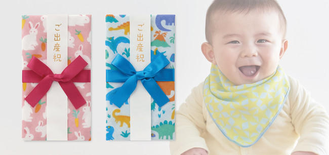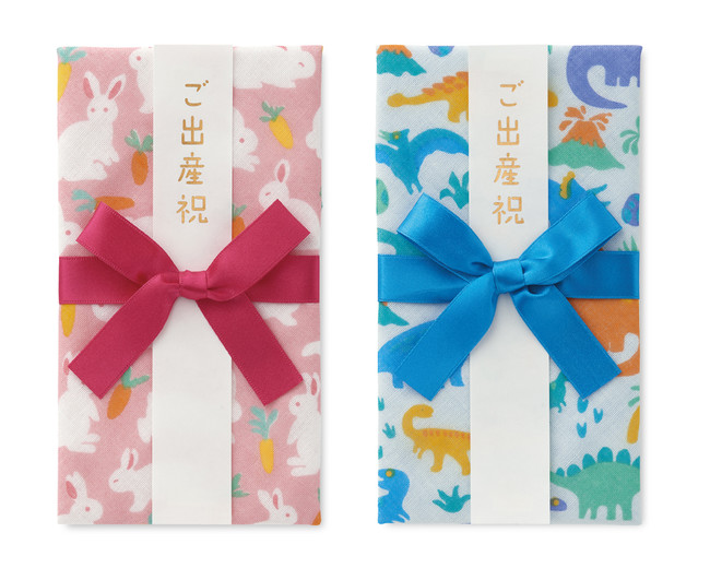なかでも発売以降ご好評いただいている、赤ちゃんのスタイ(よだれかけ)として使用できる出産お祝い用の祝儀袋『ククゥー ガーゼスタイ金封』に、今回新柄が登場。子どもたちに人気のいきものをやさしいタッチで描いた「ラビット」と「ダイナソー」の2種類が加わります。