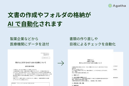 アガサ株式会社(本社:東京都中央区、代表取締役社長:鎌倉千恵美、以下「当社」)は、当社が提供する治験文書管理クラウドシステム「Agatha(アガサ)」において、2024年7月に生成AIを活用した新機能を開始予定であることを発表いたします。