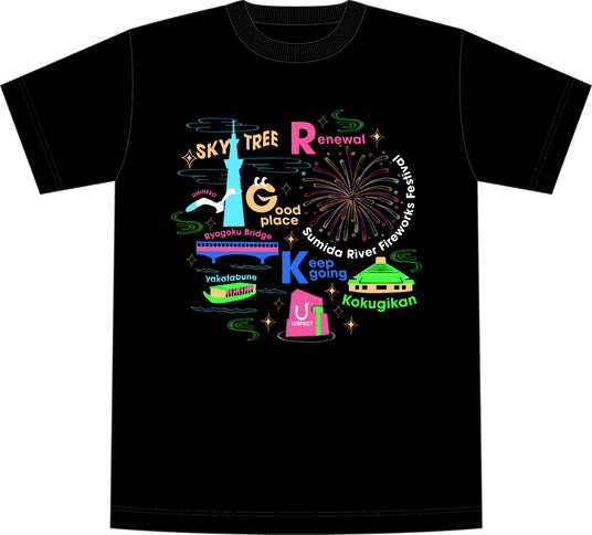 投票の結果、最優秀賞に選ばれたのは、両国の街の魅力をポップに描き出したカラフルなデザインです。東京スカイツリー、両国国技館、隅田川花火大会、屋形船、両国橋など地域を象徴するモチーフが所狭しと描かれており、それぞれの要素がアルファベットや文字と組み合わされることで、遊び心あふれるビジュアルを実現しています。