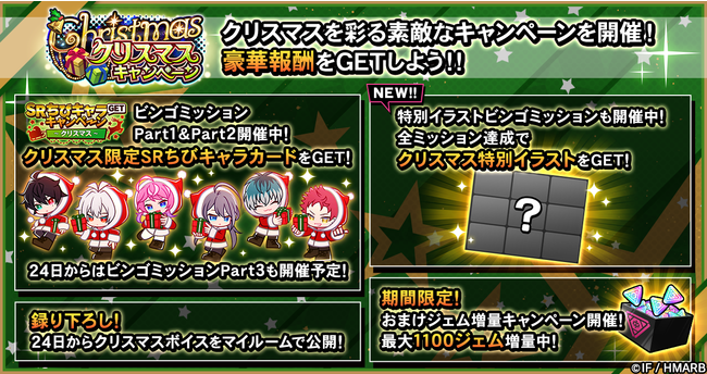 クリスマスキャンペーンのうち、「SRちびキャラGETキャンペーン~クリスマス~」では、「SR【くりすますぷれぜんと】山田一郎」「SR【くりすますぷれぜんと】碧棺左馬刻」「SR【くりすますぷれぜんと】飴村乱数」「SR【くりすますぷれぜんと】神宮寺寂雷」「SR【くりすますぷれぜんと】白膠木簓」「SR【くりすますぷれぜんと】波羅夷空却」を獲得することができます。