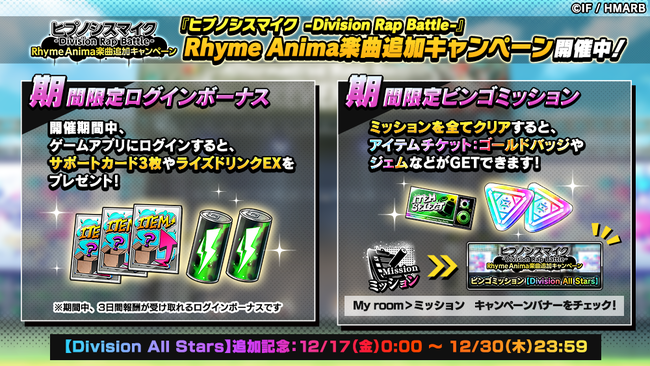 『ヒプノシスマイク -Division Rap Battle-』Rhyme Animaの楽曲追加を記念して、期間中ビンゴミッションやログインボーナスを開催します。現在、12月30日(木)23時59分まで【Division All Stars】の楽曲追加を記念したビンゴミッションとログインボーナスを開催中です。詳細はアプリ内お知らせをご確認ください。