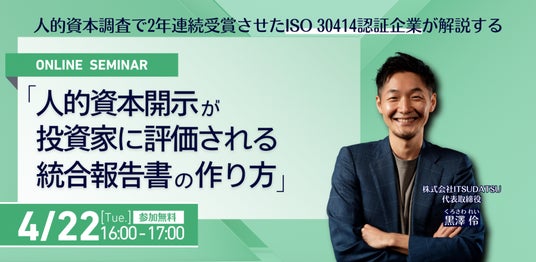 経営者特化型意識解析サービス「I AM CEO」やISO 30414/人的資本経営コンサルティングサービス等を運営する株式会社ITSUDATSU(本社:東京都港区、代表取締役CEO:黒澤伶)は、経営者や人事担当者を対象に、「人的資本調査で2年連続受賞させたISO 30414認証企業が解説する~人的資本開示が投資家に評価される統合報告書の作り方~」をテーマとした無料Webセミナーを、4月22日(火)に開催することをお知らせいたします。