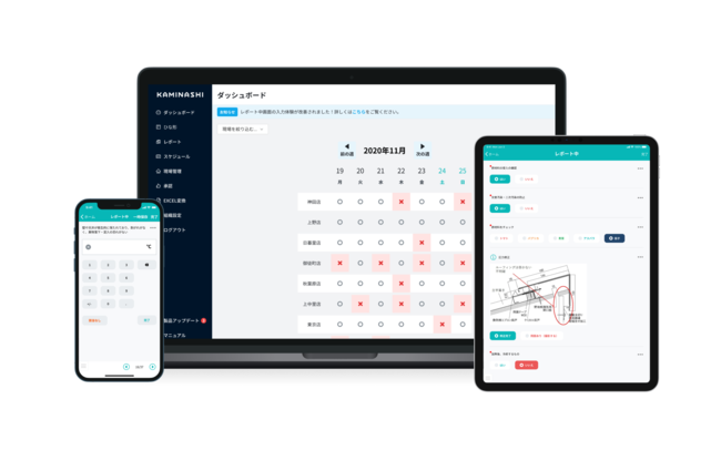 カミナシが提供する現場DXプラットフォーム『カミナシ』は、工場や店舗で日々行われる点検・作業記録などの現場管理業務をノーコードでつくったアプリで入力から一元管理できる業務効率化ツールです。手書き情報のデータ化から集計、報告書作成など、これまで紙やエクセルで行っていた業務をデジタル化することで、ペーパーレスのみならず、正しい作業手順の徹底から業務改善まで実現。2020年6月末の提供開始以来、これまでに製造や飲食、小売、物流など、業界問わず180社以上の現場DXを推進しています。利用料金は月額60,000円(税別/10アカウント)から。