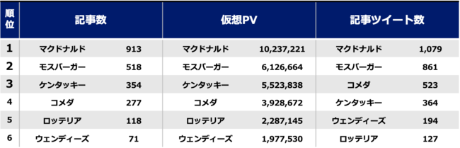 記事数・仮想PV・記事ツイート数のいずれも1位のマクドナルドは、「今年も」「待ってた」「秋の定番」といった記事見出しがつくように、もはや秋の風物詩として扱われています。