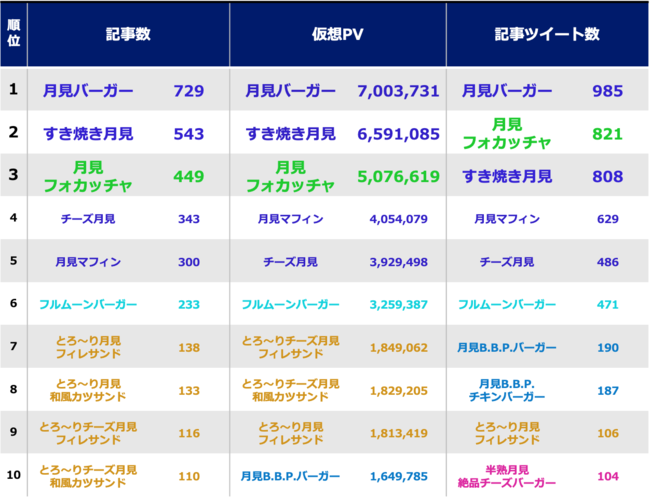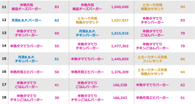 マクドナルドの「月見」商品は、すべて各数値の5位以内に入っています。