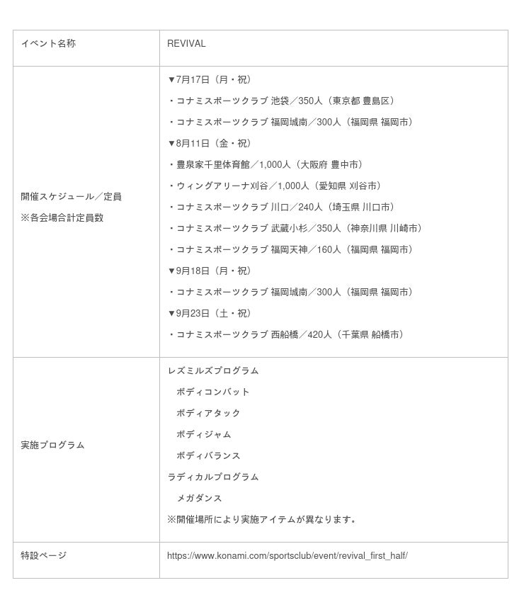 コナミスポーツ株式会社(以下、「弊社」)は、7月17日(月・祝)から9月23日(土・祝)にかけて、全国9会場でスタジオプログラムイベント「REVIVAL」を開催します。