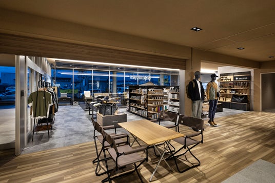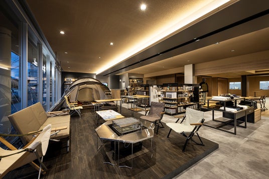 併設する自動車ショールーム内では、商談デスクとしてスノーピーク商品を利用した「キャンピングオフィス」も展開