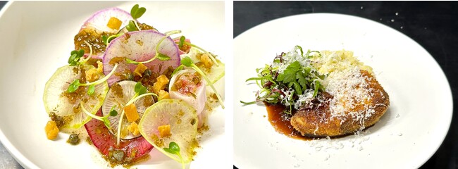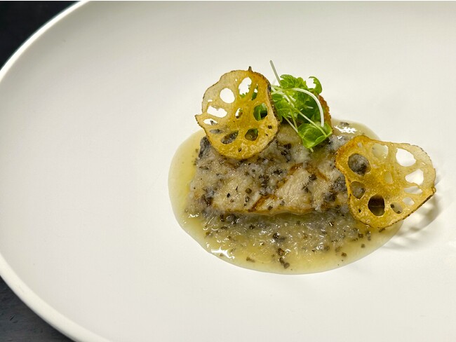 天然能登寒ぶりの塩麹マリネは、脂の乗ったぶりを塩麴でマリネし、たっぷりのホリ乳業のヨーグルトソース、希少なオシェトラ種のキャビアと一緒にお召し上がりいただきます。天然能登寒ぶりのグリルは、ふっくらと焼き上げたぶりとサクサクの加賀れんこんの異なる食感を合わせた一品で、フランス産の黒トリュフと合わせ芳醇な香りとともにお楽しみいただけます。天然能登寒ぶり昆布締めコンフィと大根は、昆布締めにして身が引き締まったぶりを、金沢ヤマト味噌玄米甘糀ソースの味わい豊かなソースでご堪能ください。レモン風味のリゾットと一緒にお召し上がりいただく天然能登寒ぶりのカツレツは、濃厚なリゾットと相性抜群の爽やかな能登リーフサラダを添え、パルメザンチーズをトッピングした満足感のある一品です。