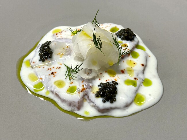 ・天然能登寒ぶりの塩麹マリネ 蕪 ホリ乳業ヨーグルトソース ディル風味 ベルギー産オシェトラキャビア