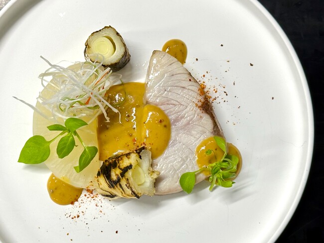 ・天然能登寒ぶり昆布締めコンフィと大根 きよし農園の長ネギと柚子 金沢ヤマト味噌玄米甘糀ソース