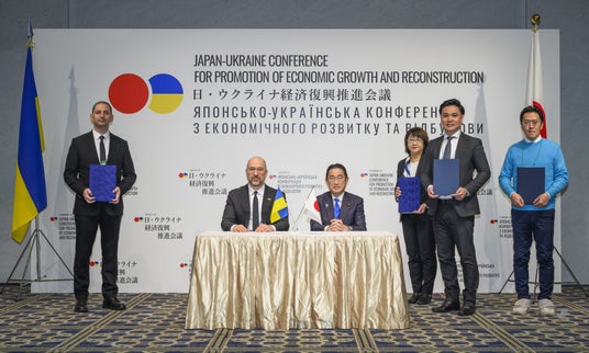提供:経団連 |(左から)ウクライナ関係企業代表、ウクライナ シュミハリ首相、岸田総理、日本企業関係者(うち中央 アルダグラム共同創業者 CEO 長濱光)