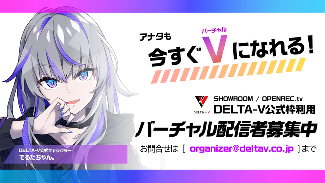株式会社DELTA-VではSHOWROOM / OPENREC.tv…等のライブ配信プラットフォームにてDELTA-V公式枠をご利用されるバーチャル配信者を募集しております。「個人Vの公式枠利用」という形で個人活動という立場を維持しながら利用できますのでお気軽にお問い合わせください。