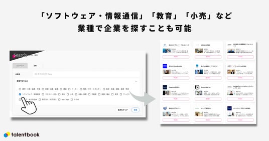 talentbookにコンテンツを掲載している企業が一覧で表示されています。企業は検索ページからも検索することができます。