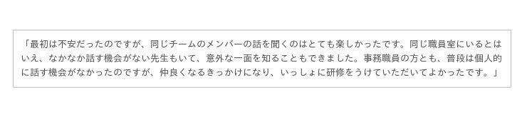 ワークショップ後に協和中学校の教員・職員の方々から感想をいただくことができました。以下はその一部を抜粋して記載させていただきます。