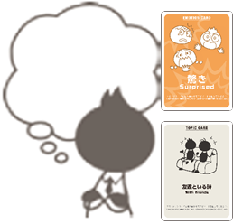 「エモーションカード」と「トピックカード」の2枚を引き、話すエピソードを考えます。