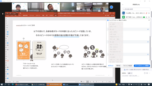 実施日は2021年11月25日(木)。コロナ禍という状況も鑑みて、オンライン開催しました。ワークショップ参加者は、香川県高松市立協和中学校の教員、職員の計40名。ワークショップをファシリテートするのはSEGA XDから4名が参加し、社員教育向けカードゲーム「 emotcha(エモッチャ)」を用いて約2時間のワークショップを開催しました。