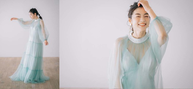 チュールをたっぷりと使用した、透明感が美しいスレンダーラインのドレス
