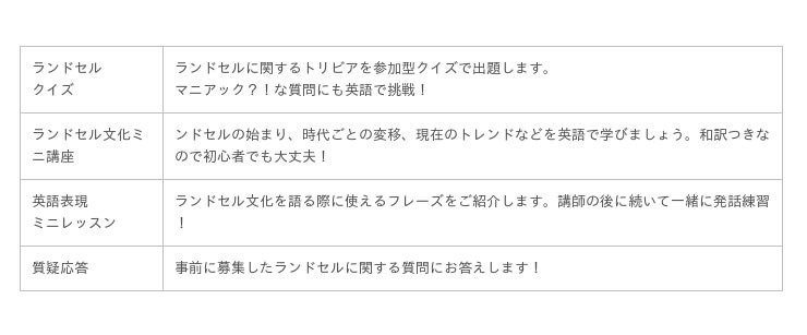 ・一般社団法人日本鞄協会ランドセル工業会と協力し、130年以上に渡るランドセルの起源や歴史、ランドセルを贈る国際支援活動など、日本人でも意外と知らない「ランドセルの文化」を紹介
