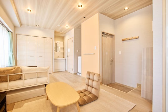 家具や家電を備え付けた明るくスタイリッシュな室内が特徴。床や壁紙の色調、温かみのある照明の演出により、「癒しと軽やかさ」をコンセプトにした空間に仕上げています。