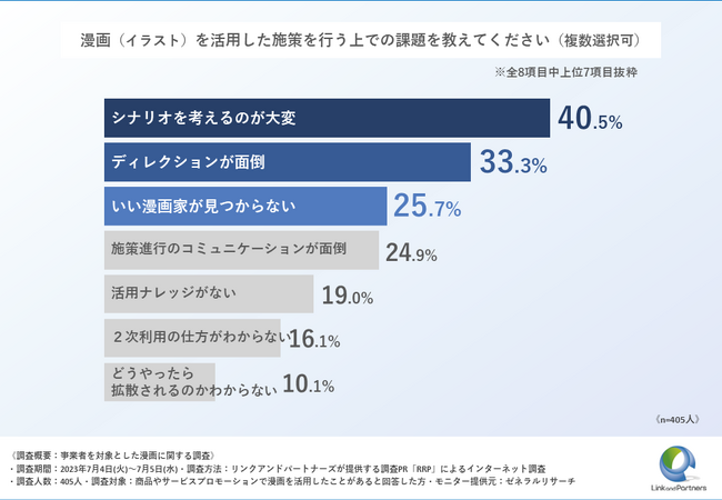一方で、「漫画(イラスト)を活用した施策を行う上での課題」は「シナリオを考えるのが大変」が40.5%で最多