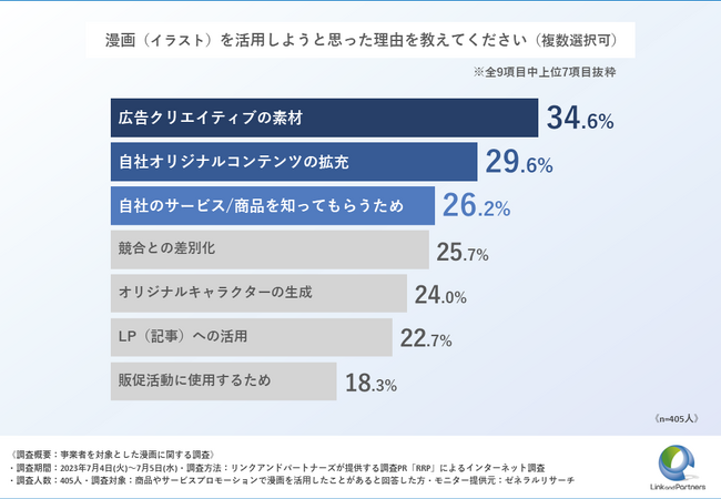 「漫画(イラスト)を活用しようと思った理由」は、上位から「広告クリエイティブの素材」が34.6%、「自社オリジナルコンテンツの拡充」が29.6%、「自社のサービス/商品を知ってもらうため」が26.2%という結果となりました。
