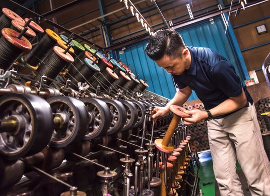 当社が2014年に愛知県一宮市に新設した“ものづくりの拠点”。その源泉となる「英式紡績機」は70年前に製造されたものであり、国内に現存する物はほとんどありません。産業革命の時代の手工業から機械工業への過渡期の記憶を残す希少な紡績機により、現代に普及している仏式紡績機では出せない風合いの糸を生み出します。一宮工場で企画開発されたオリジナリティの高い糸や生地は、国内外のブランドから高く評価されています。