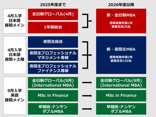 なお、英語で学ぶプログラムである「全日制グローバル(9月入学)<International MBA>」、「MSc in Finance」、「早稲田-ナンヤン ダブルMBA」については、募集定員も含め変更はありません。
