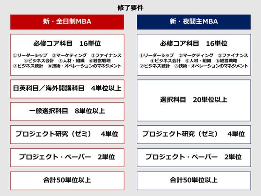 プログラム改編に合わせてMBAのカリキュラム改革も行います。全日制MBA・夜間主MBAともに、修了要件は「コア科目」「選択科目」「ゼミ」「ペーパー」から構成され、合計必要単位は現行と同じ50単位です。