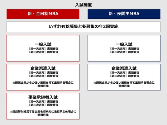 改編後の日本語によるプログラムの入試は、現行と同様に秋募集と冬募集の年2回実施する予定です。新・全日制MBAにおいては一般入試、企業派遣入試、事業承継者入試の3制度を、新・夜間主MBAにおいては一般入試、企業派遣入試の2制度を設けます。