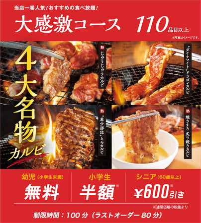 アルコールをご注文の方にオススメのコースは、やはり一番人気の大感激コース!じゅうじゅうカルビが誇る4大名物カルビがすべて食べ放題となり、特に「じゅうじゅうカルビ」や「“希少部位”とろカルビ」などジューシーなお肉はアルコールとの相性が抜群です。さらに小学生未満のお子様は無料、小学生は半額、60歳以上のお客様は税込金額から600円引きです!