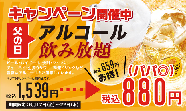 株式会社トマトアンドアソシエイツ(本社:兵庫県西宮市、代表取締役社長:小林 大二)が運営する、焼肉食べ放題「じゅうじゅうカルビ」では、2022年6月17日(金)から2022年6月22日(水)まで、“父の日イベント”としてアルコール飲み放題を880円(税込)で販売いたします。