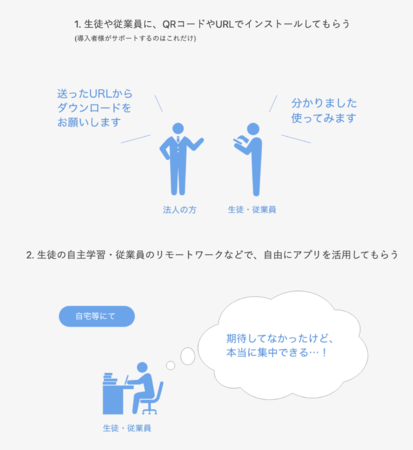 QRコードやURLで生徒や従業員にアプリをインストールしてもらい、自由に活用してもらう方式です。