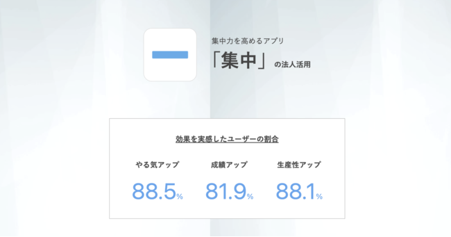 「集中」 は、元データアナリストが 「勉強や仕事に集中できない」 という心理を徹底分析して開発したアプリで、ユーザーの80%以上が 「成績・生産性がアップした」 と回答しています。法人活用の用途としては、学校・塾の生徒の自主学習、リモートワーク推進企業の従業員の自己管理のサポート等が見込まれます。