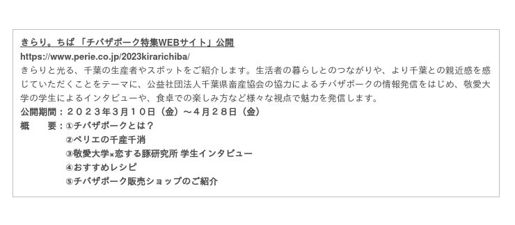 株式会社千葉ステーションビルが運営する千葉県内の駅ビル・商業施設「PERIE」(以下ペリエ)では、地域の魅力や良さを発掘、発信するという企業理念に基づき、ペリエ4館(稲毛、西千葉、津田沼、西船橋)にて「きらり。ちば“千葉県の美味しいもの”フェア」を開催しています(2023年3月1日~31日)。本企画では、2023年1月から当社が掲げるサステナビリティ活動「PERIE SUSTAINABLE LIFE」の第3弾として千葉の文化継続・食育、地域経済活性を目指し、敬愛大学 経済学部、国際学部との産学連携および公益社団法人千葉県畜産協会の協力の下、全国屈指の養豚県でもある千葉県のブランド「チバザポーク特集」を実施します。